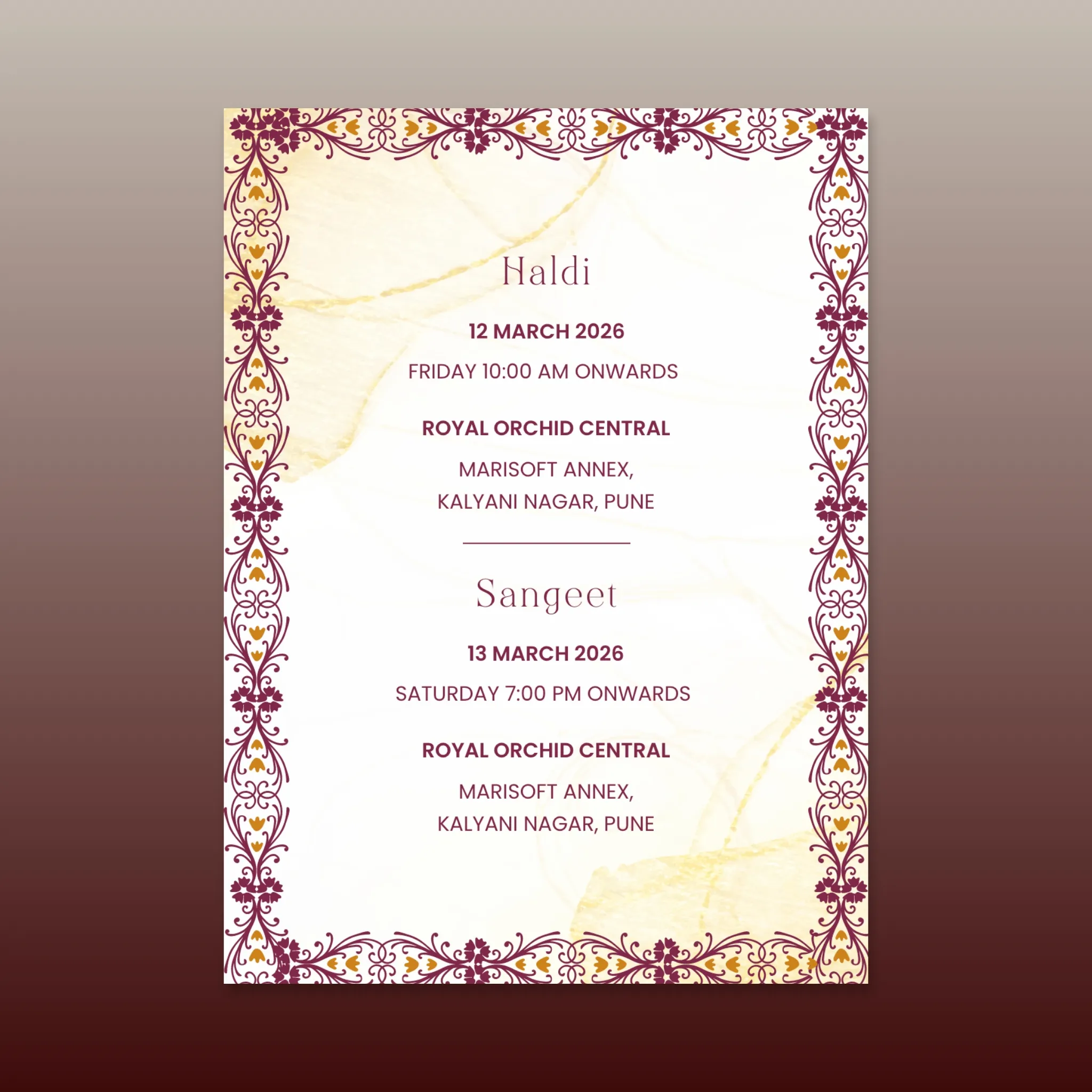 Name your events as creatively or traditionally as you wish — “Ananya’s Haldi,” “Rohan’s Baarat,” or “Sufi Night with Friends” — your card, your way.