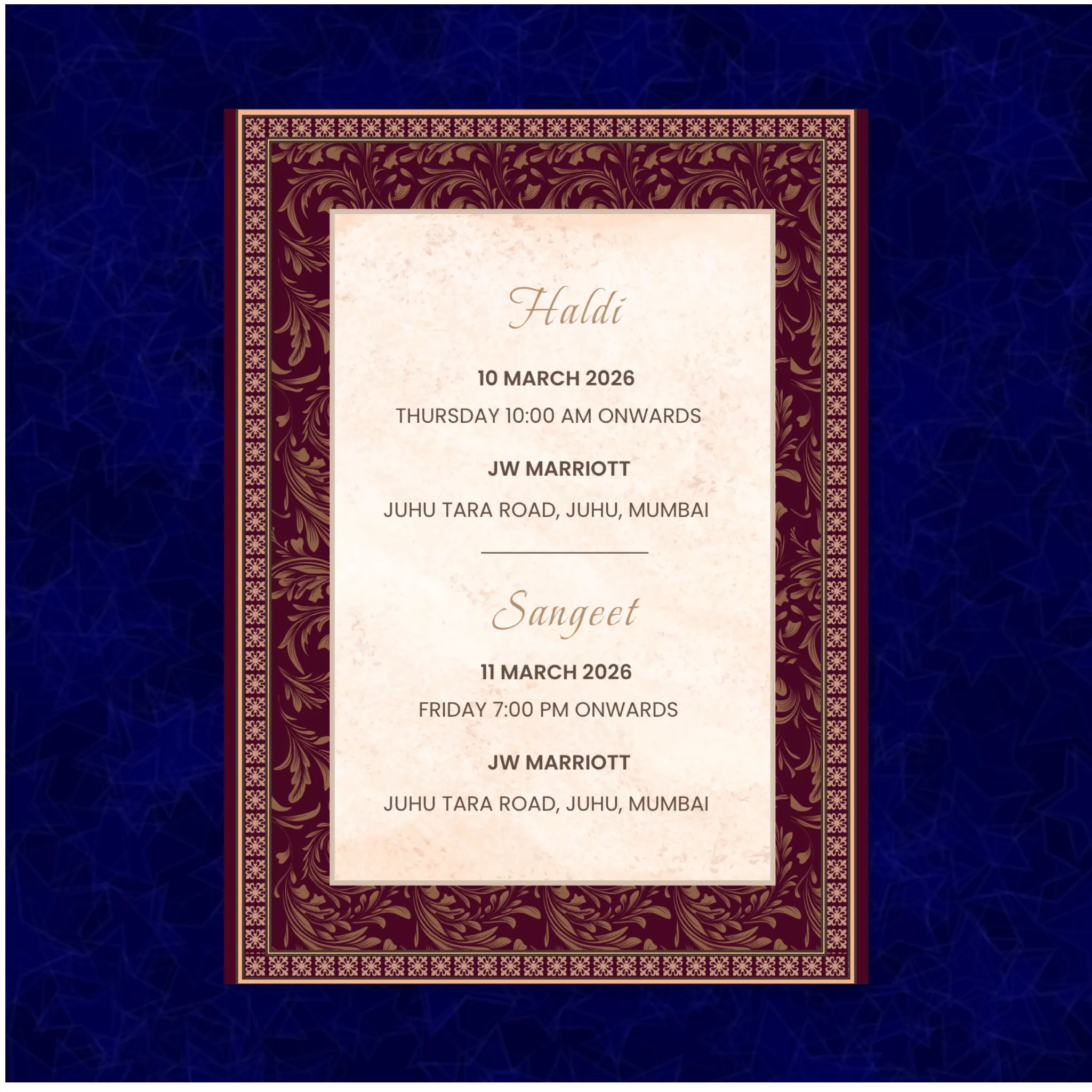 Name your events as creatively or traditionally as you wish — “Ananya’s Haldi,” “Rohan’s Baarat,” or “Sufi Night with Friends” — your card, your way.
