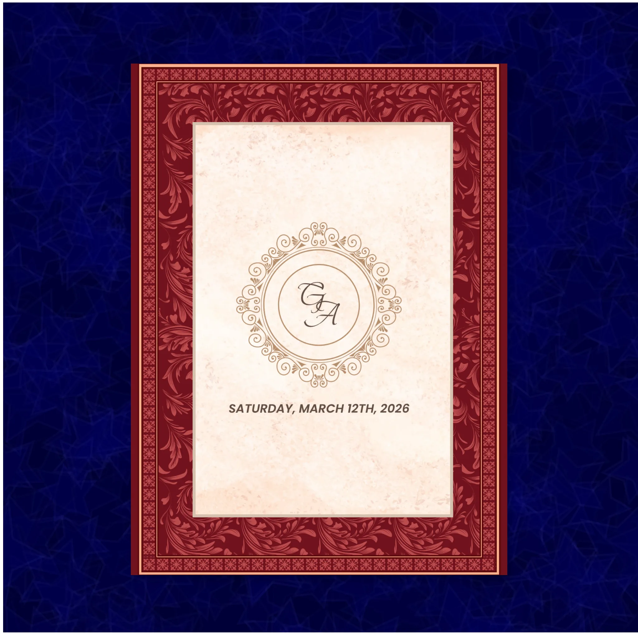 This design showcases a rich crimson backdrop adorned with intricate gold borders and geometric Islamic artistry. The ornate typography and symmetrical detailing create a royal, timeless aesthetic, often chosen for its luxurious appeal and culturally rooted wedding sophistication.