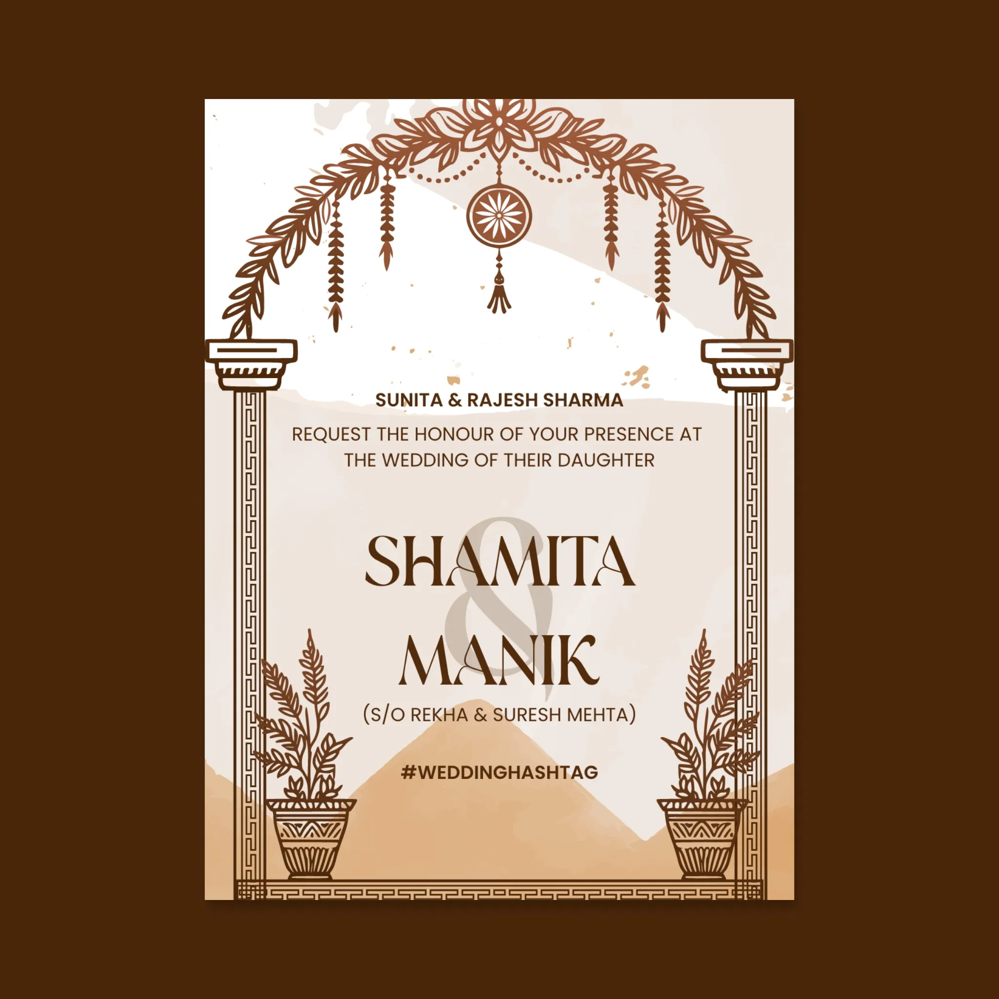 A vertical, multi-panel e-card with a minimalist, earthy color palette and a distinctive architectural framework. Each section is outlined by classical pillar columns and a semi-circular garland border, resembling a mandap. The design uses clean, modern sans-serif fonts for excellent readability and a flowing script for key titles, signifying a blend of timeless tradition and modern sophistication for a multi-day wedding.