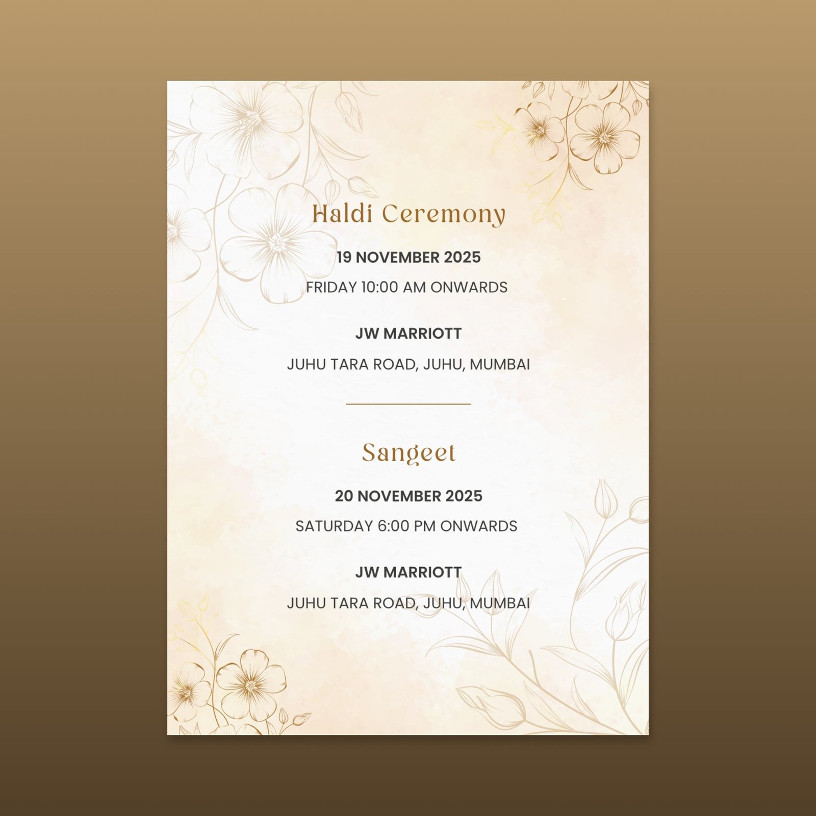 Name your events as creatively or traditionally as you wish — “Ananya’s Haldi,” “Rohan’s Baarat,” or “Sufi Night with Friends” — your card, your way.