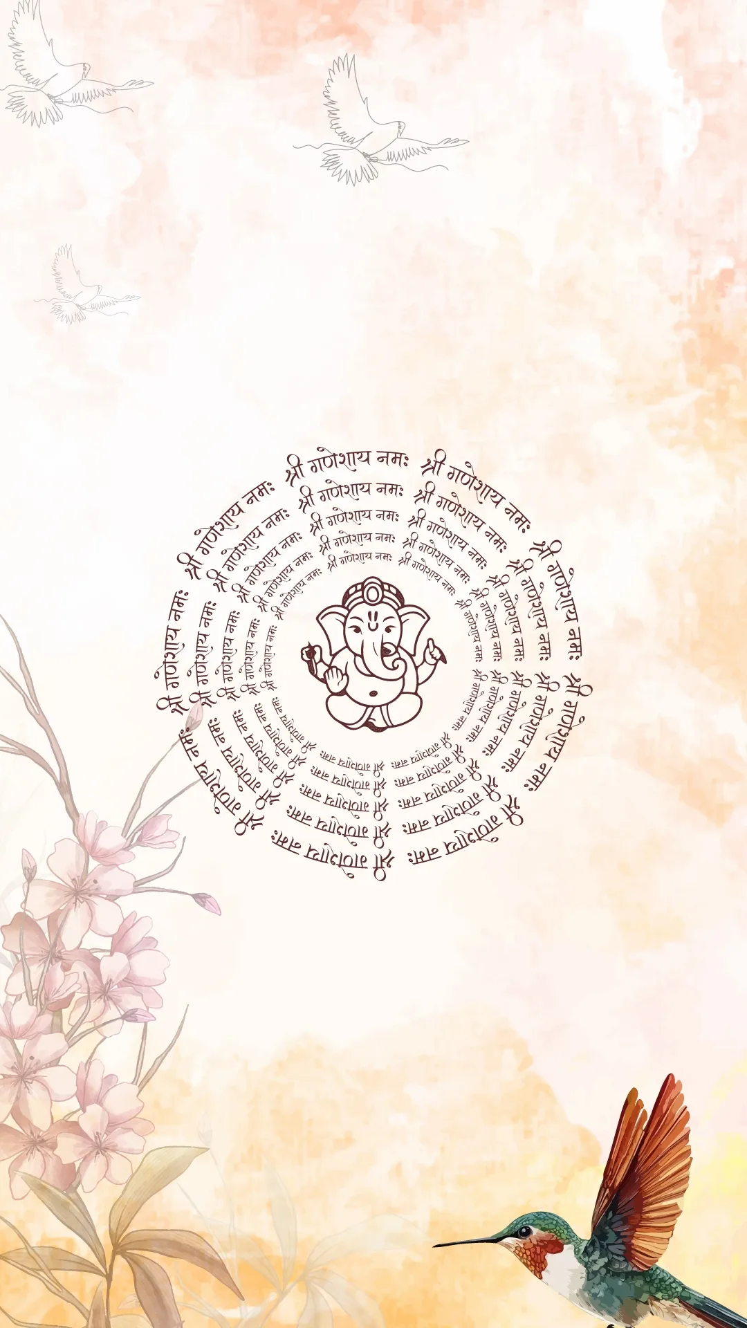 A dreamy multi-panel animated wedding video card featuring a warm sunset watercolor backdrop and rich floral borders. A unique hummingbird and circular sacred shloka add a spiritual touch. Elegant modern script paired with clean serif text beautifully presents every function, perfect for a romantic multi-day Indian celebration.