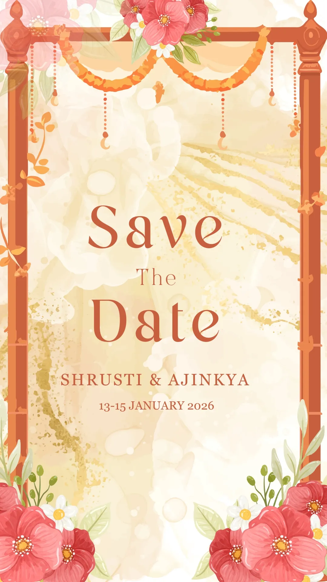 This video card design features a striking abstract watercolor backdrop that blends modern blush pink with muted earthy tones. Created as a complete wedding suite, it presents every event from Haldi and Sangeet to the Wedding and Reception with clarity and style. A graceful script highlights key names, balanced by a clean sans-serif font for the details. Contemporary, romantic, and visually unique, this aesthetic is perfect for couples who want a modern yet heartfelt celebration.