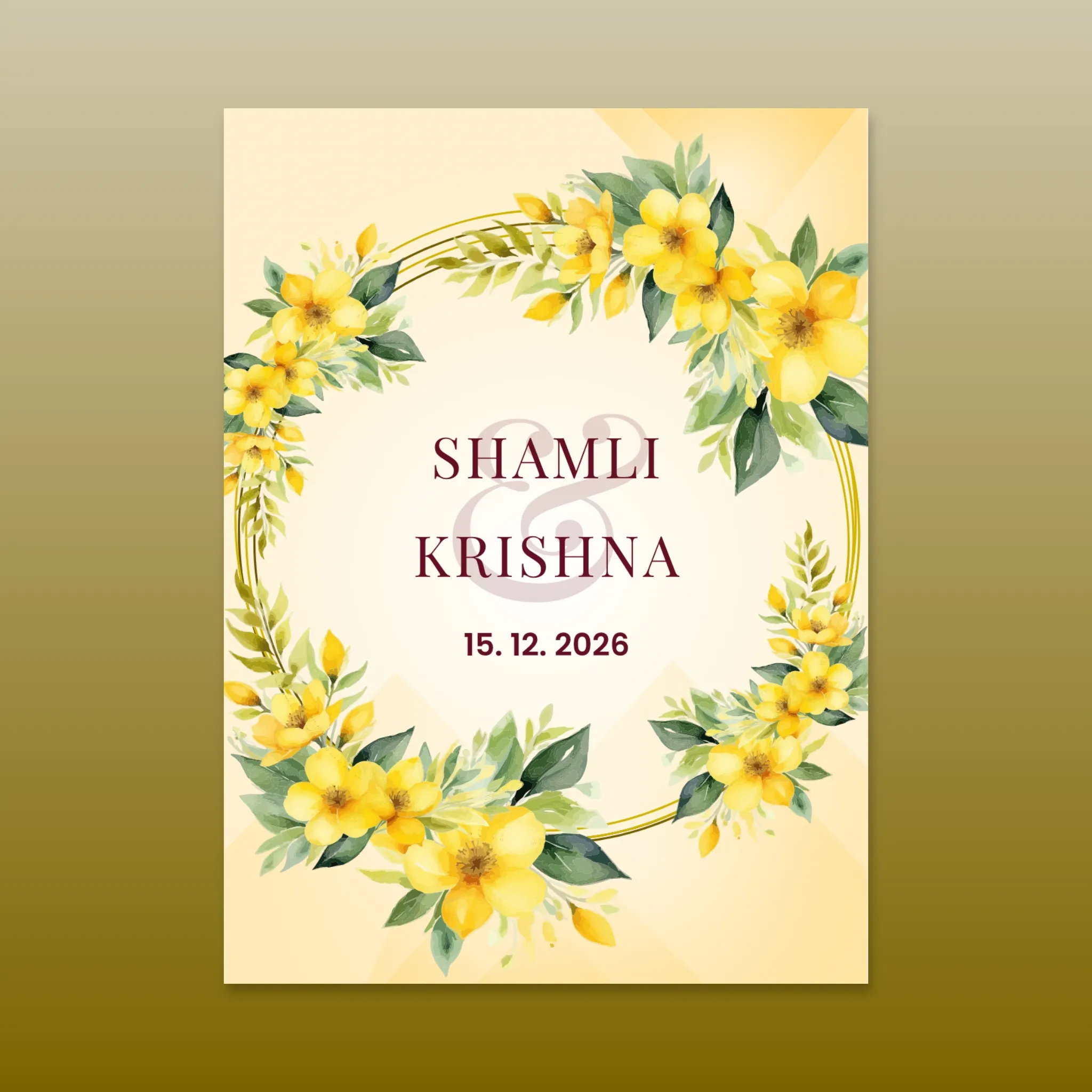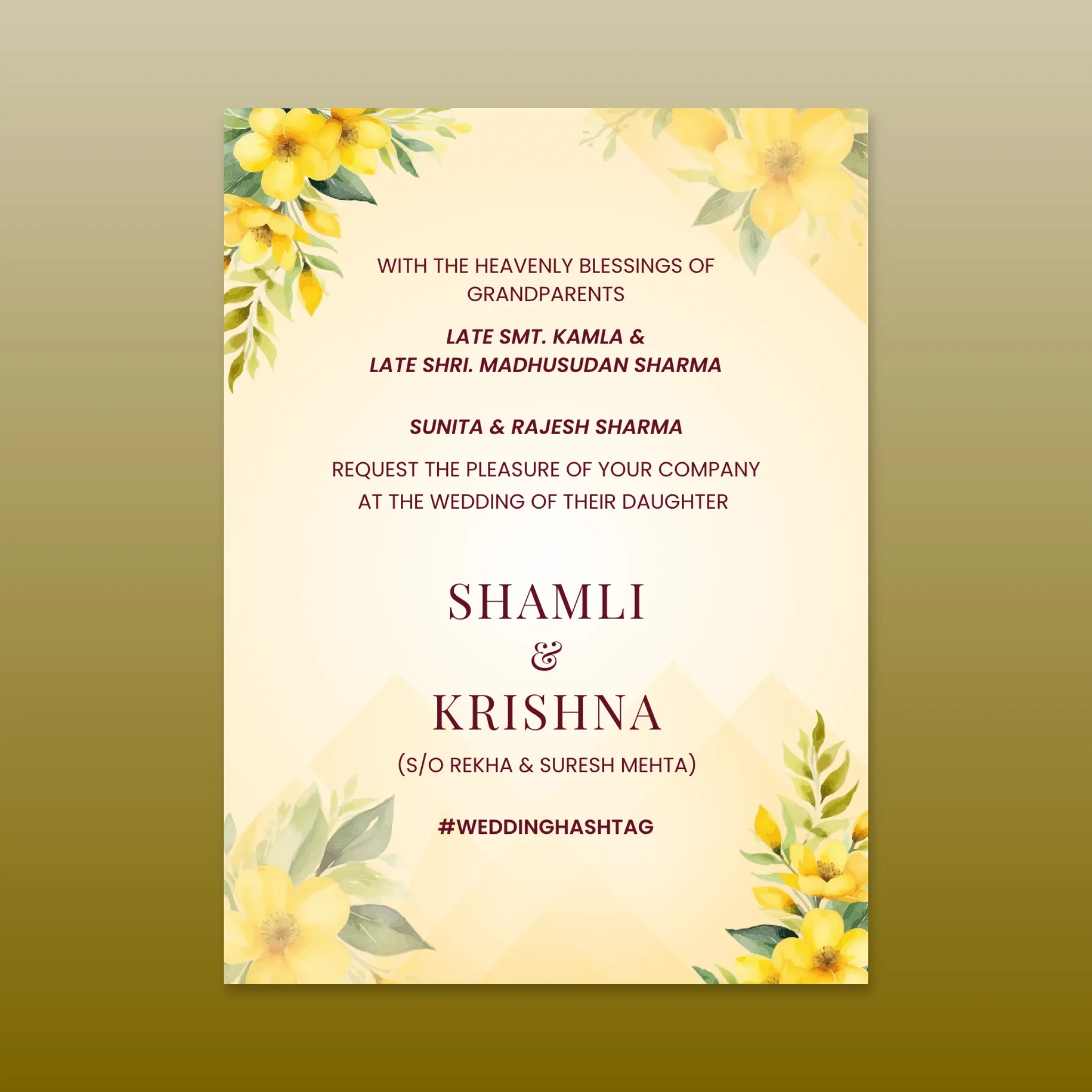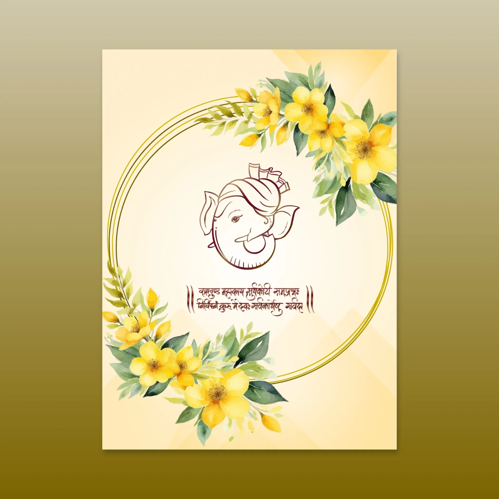 A vertical, multi-panel design featuring a sunny yellow watercolor background that fades to white at the center. Each section is prominently framed by a continuous, vibrant marigold wreath, symbolizing auspiciousness and joy. The design incorporates Hindu iconography and utilizes a striking mix of elegant calligraphy and highly readable sans-serif fonts, perfect for a bright, festive, and traditional wedding announcement.