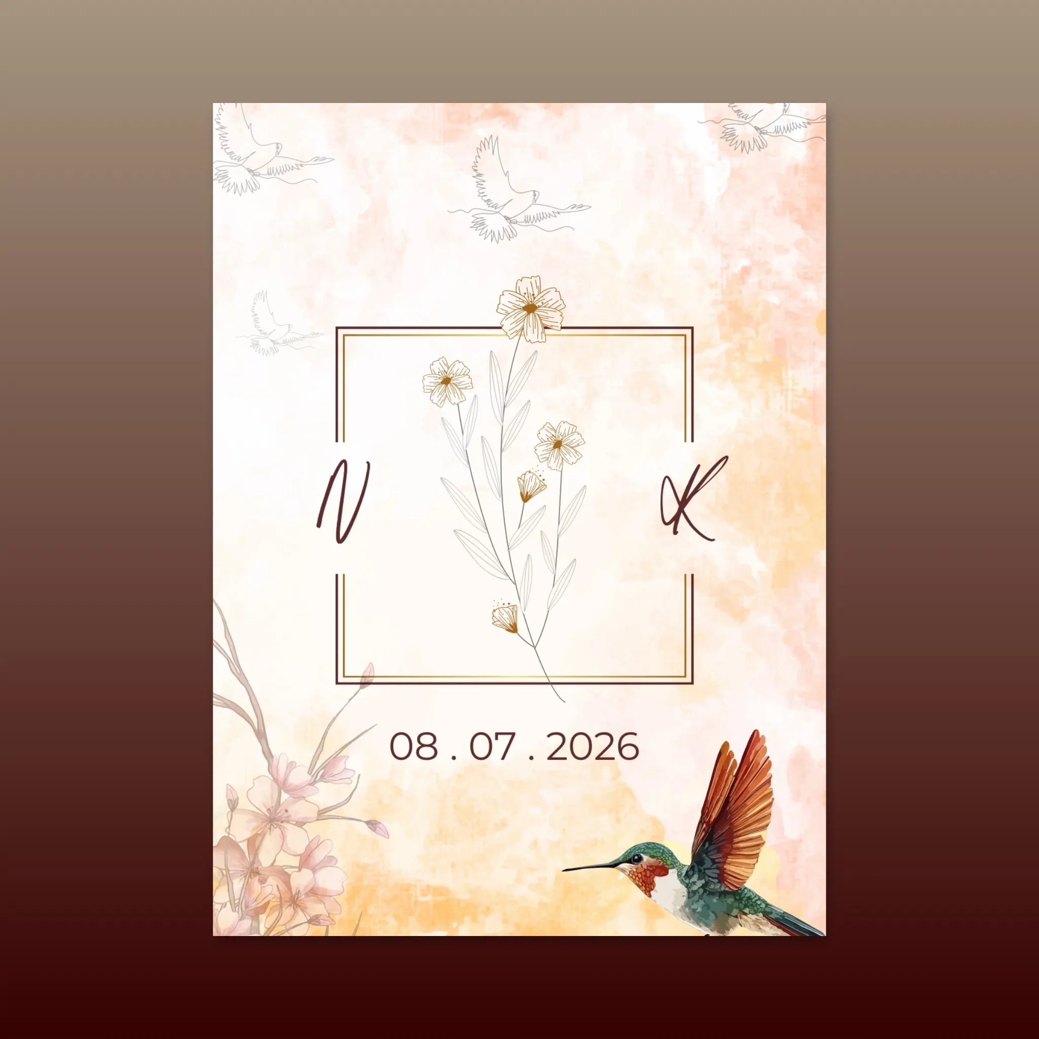 A dreamy multi-panel e-card featuring a warm, sunset-toned watercolor background with rich floral borders. The design incorporates a unique hummingbird element and a circular sacred text (shloka) for a spiritual touch. It utilizes a combination of elegant, modern script and clean serif fonts across multiple distinct panels, making it an ideal choice for detailing a romantic, multi-day Indian wedding celebration.