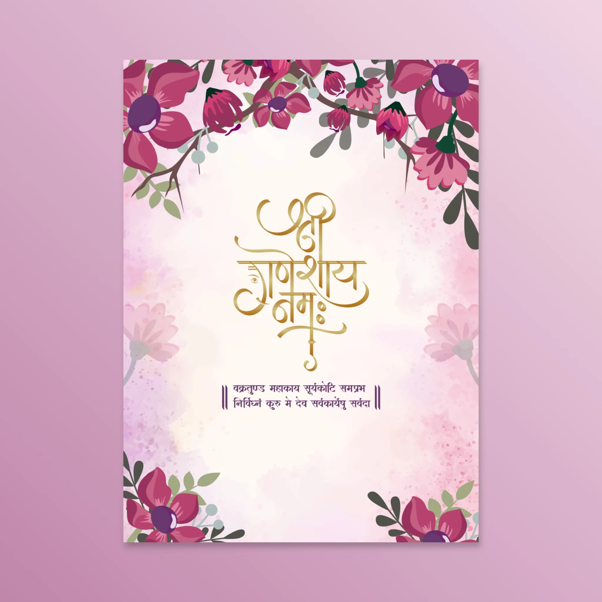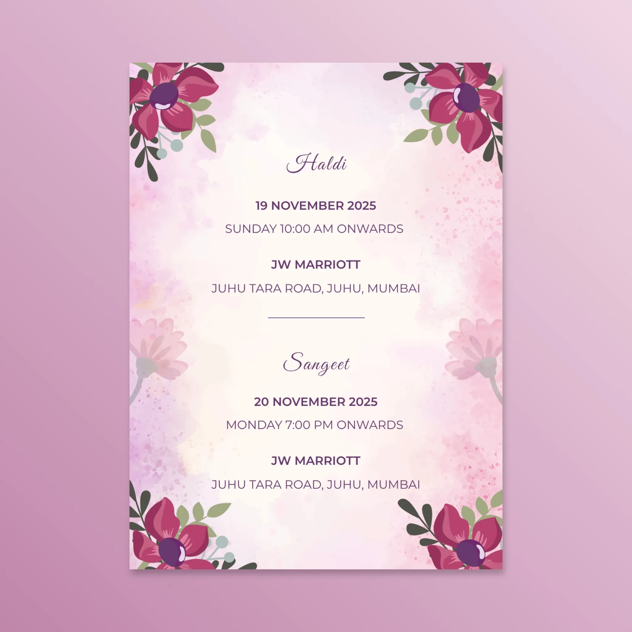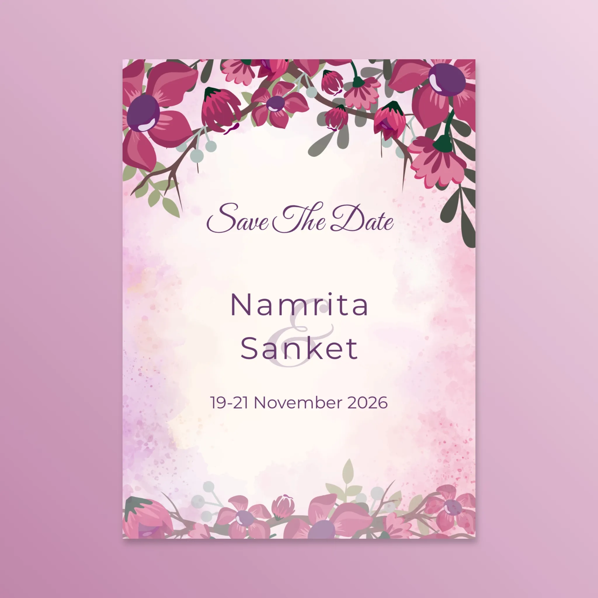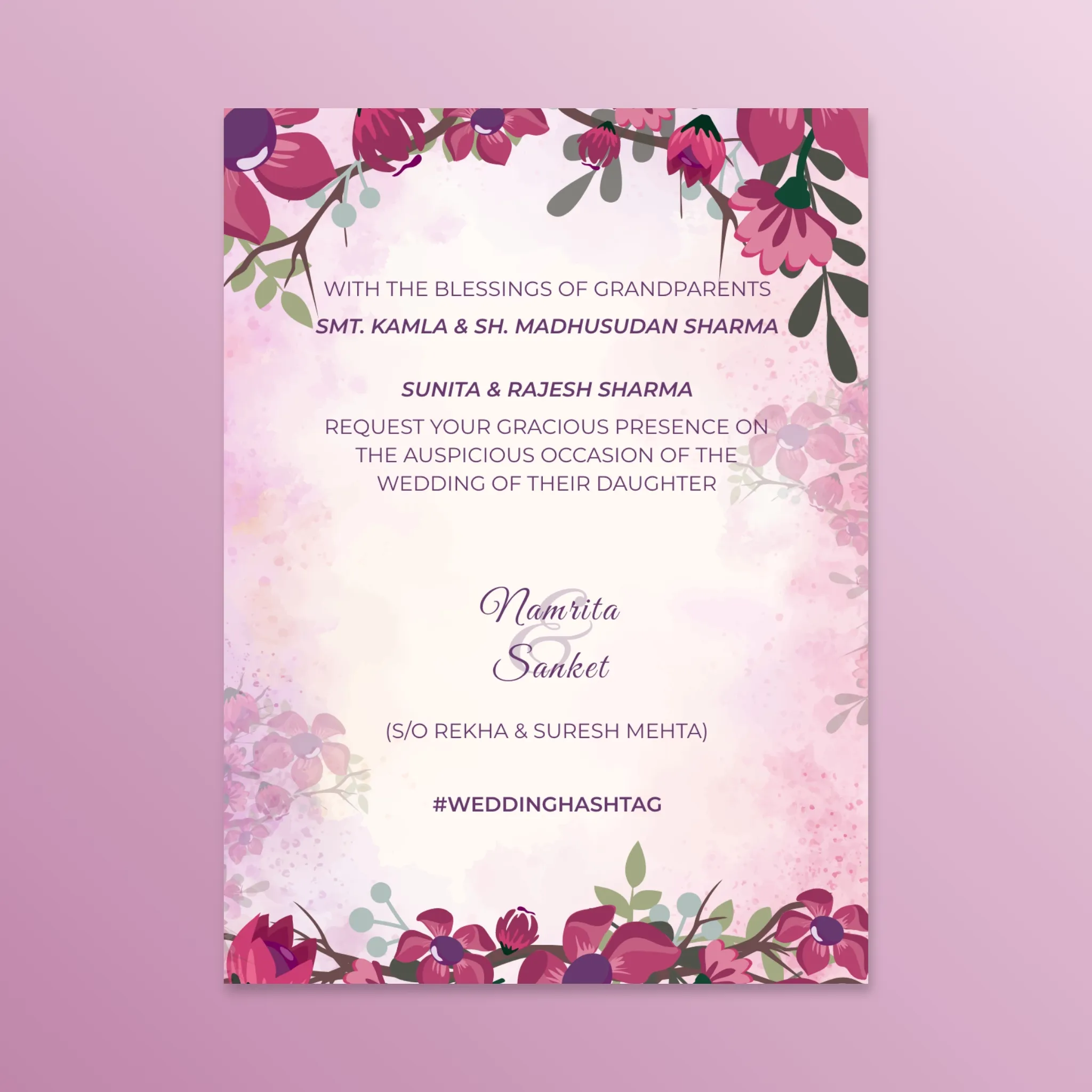 This design exudes elegance with watercolor florals in rich magenta tones against a soft blush background. The golden typography and ornamental flourishes add a touch of royalty and warmth. Perfect for modern couples, it captures the harmony of traditional Indian artistry with contemporary watercolor finesse—ideal for heartfelt, timeless weddings.