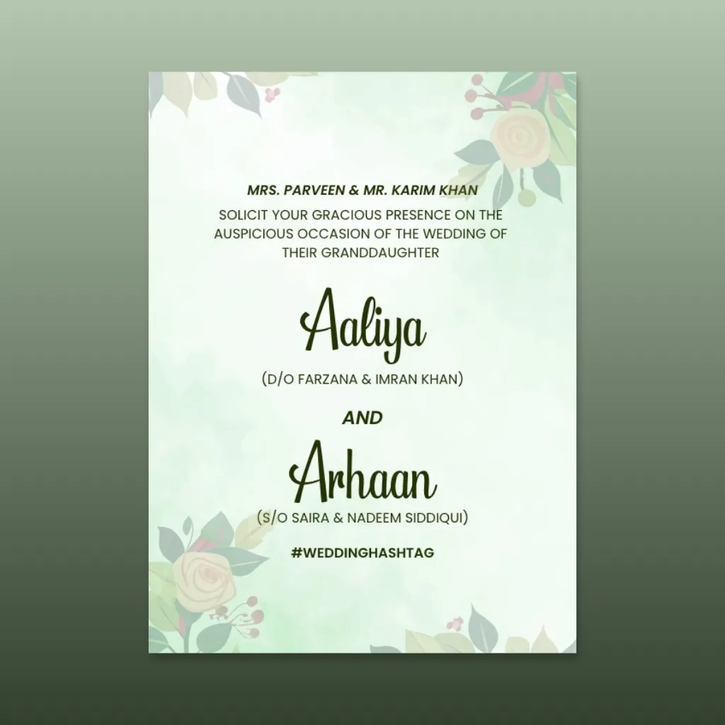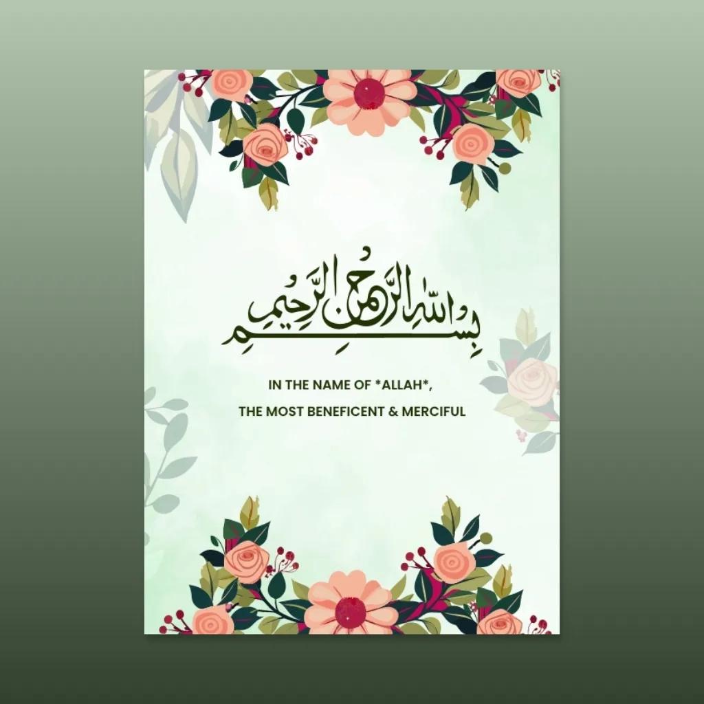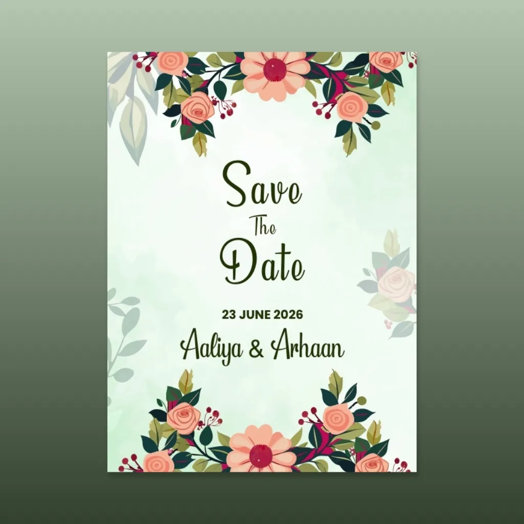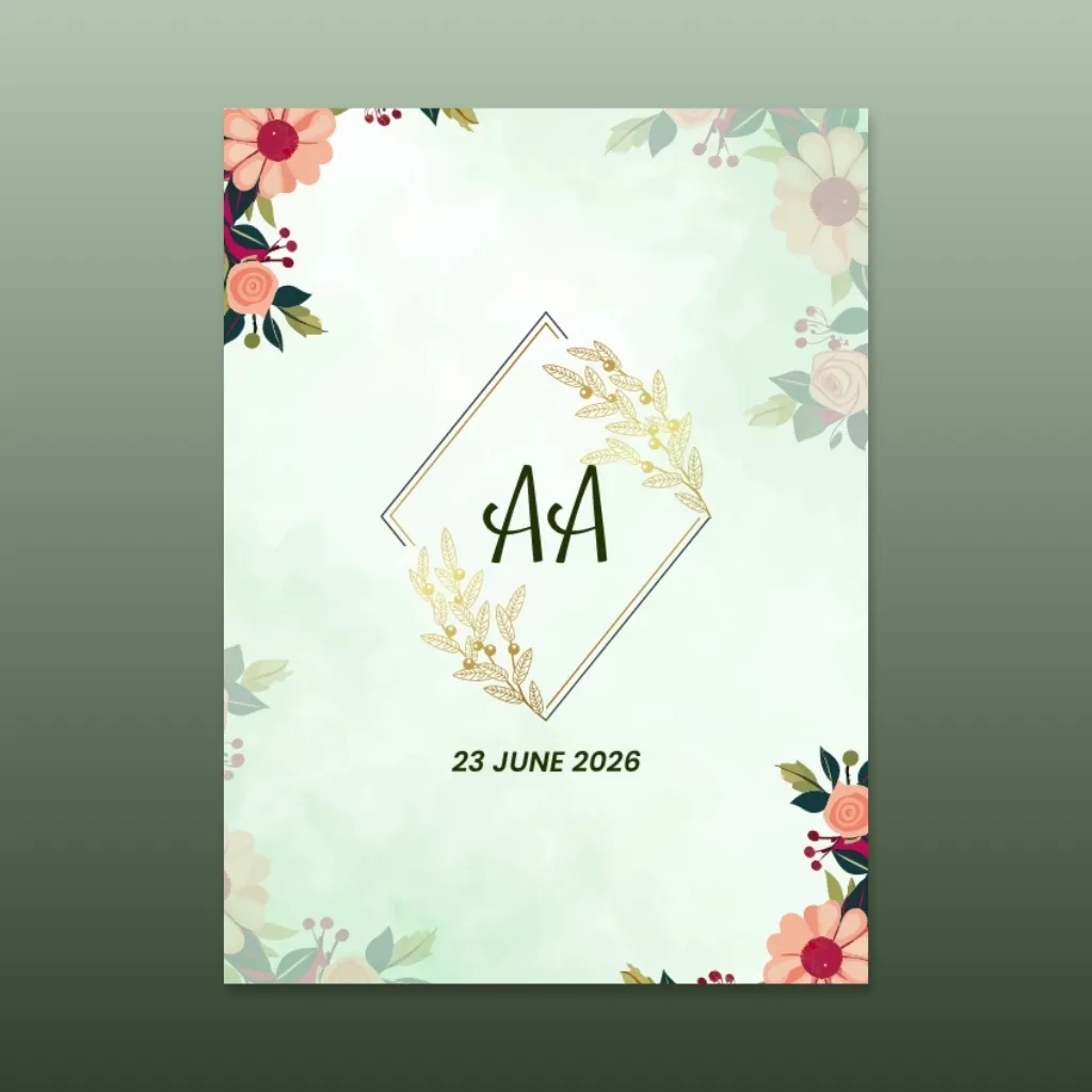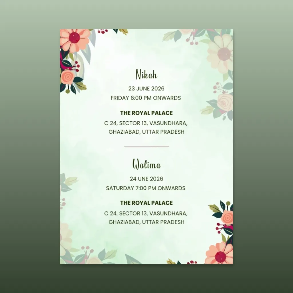 A soothing mint-green watercolor base paired with vibrant hand-painted florals and refined Arabic calligraphy. This design blends soft botanical aesthetics with elegant serif typography, making it ideal for joyful, nature-inspired Islamic wedding celebrations.