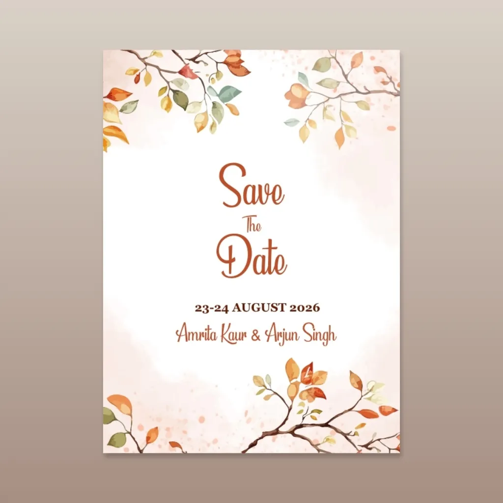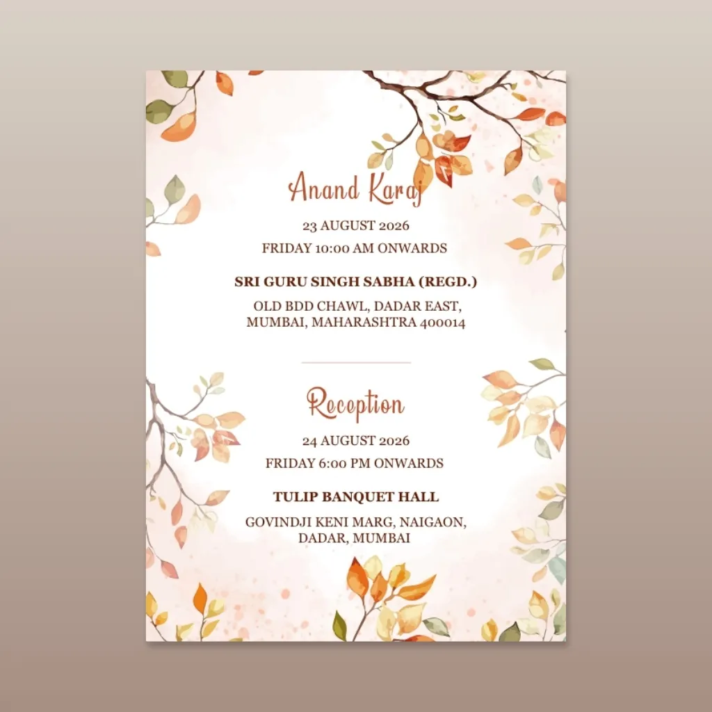 A serene Sikh-inspired watercolor design featuring warm autumn leaves, soft peach tones, and elegant traditional script, symbolizing divine blessings and graceful wedding aesthetics.