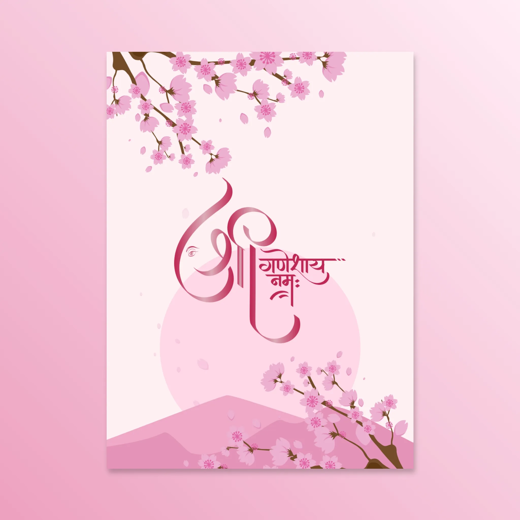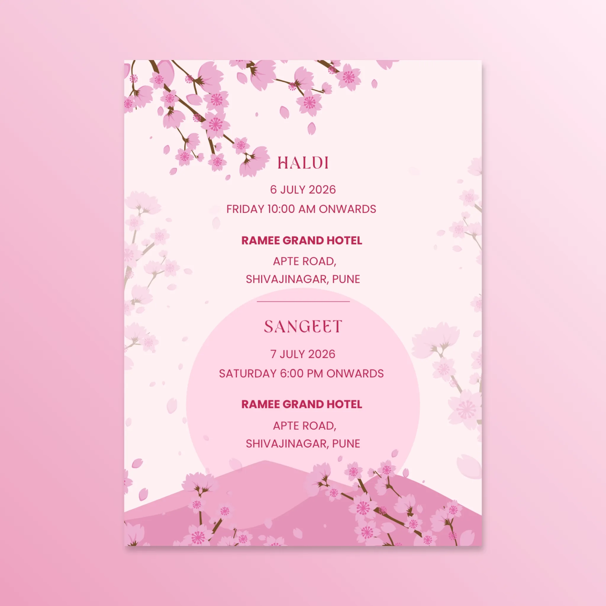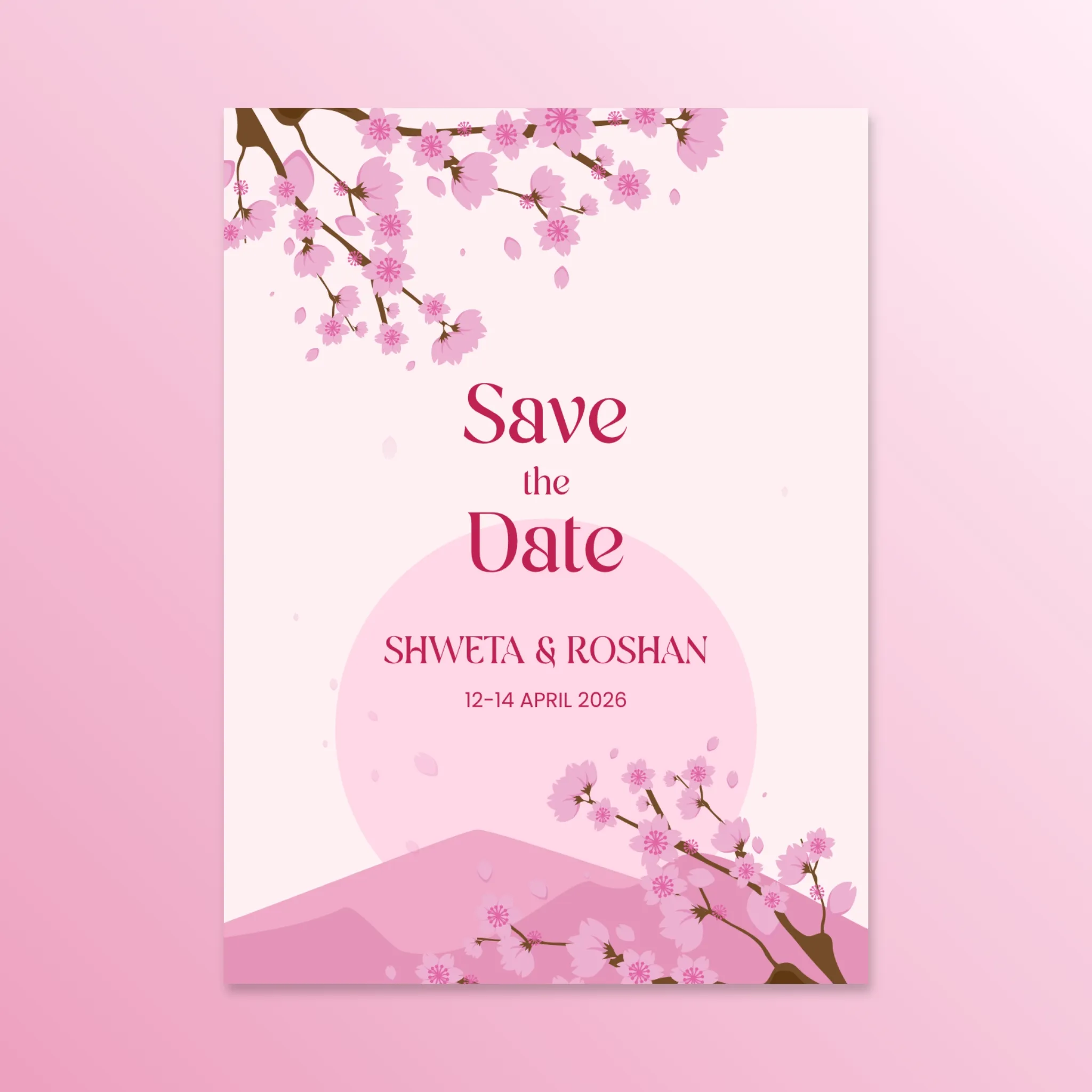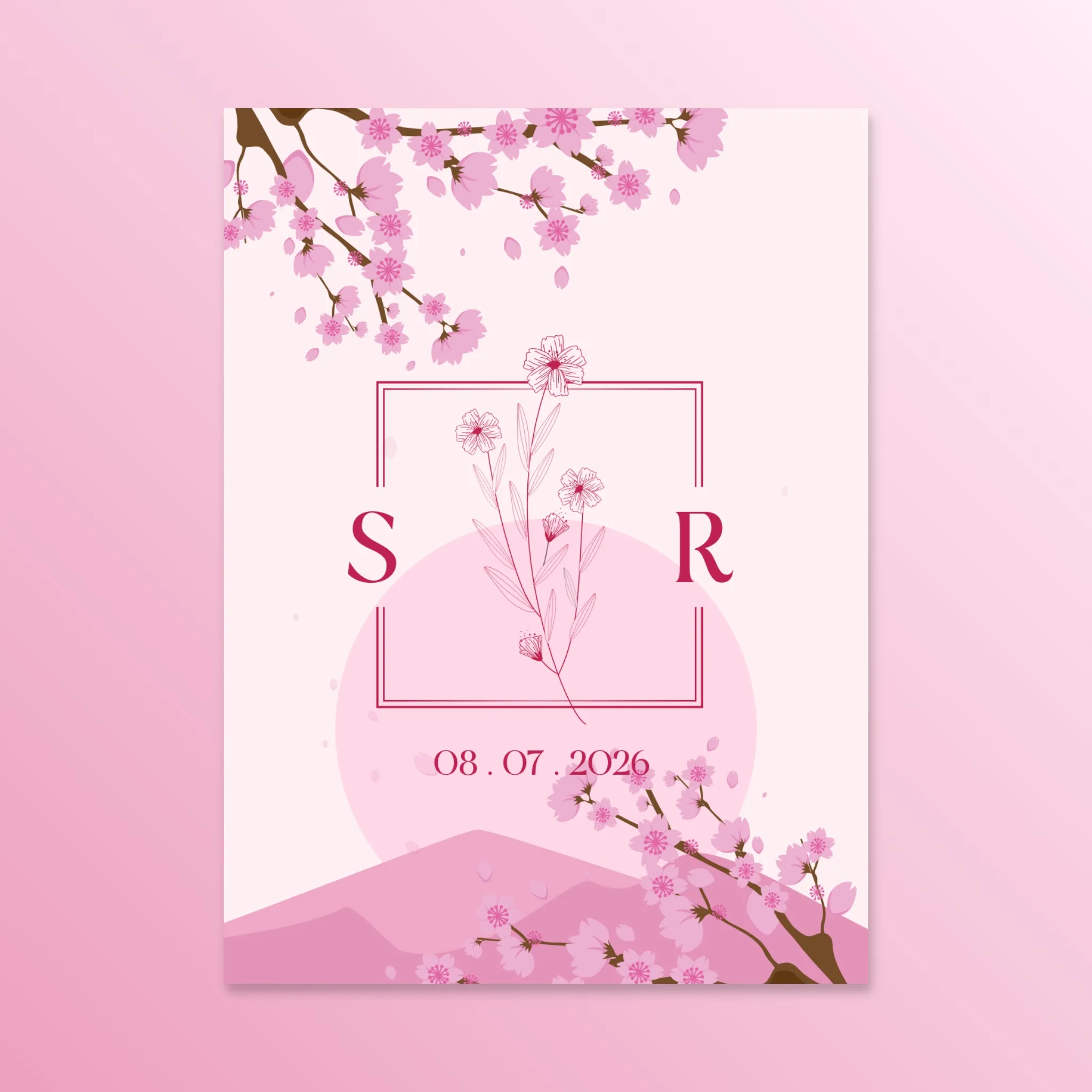 Inspired by spring’s gentle beauty, this design blends cherry blossom illustrations with elegant serif fonts and a subtle mountain backdrop. The pastel tones and minimal structure reflect romance and serenity, making it perfect for modern weddings that value simplicity and elegance.