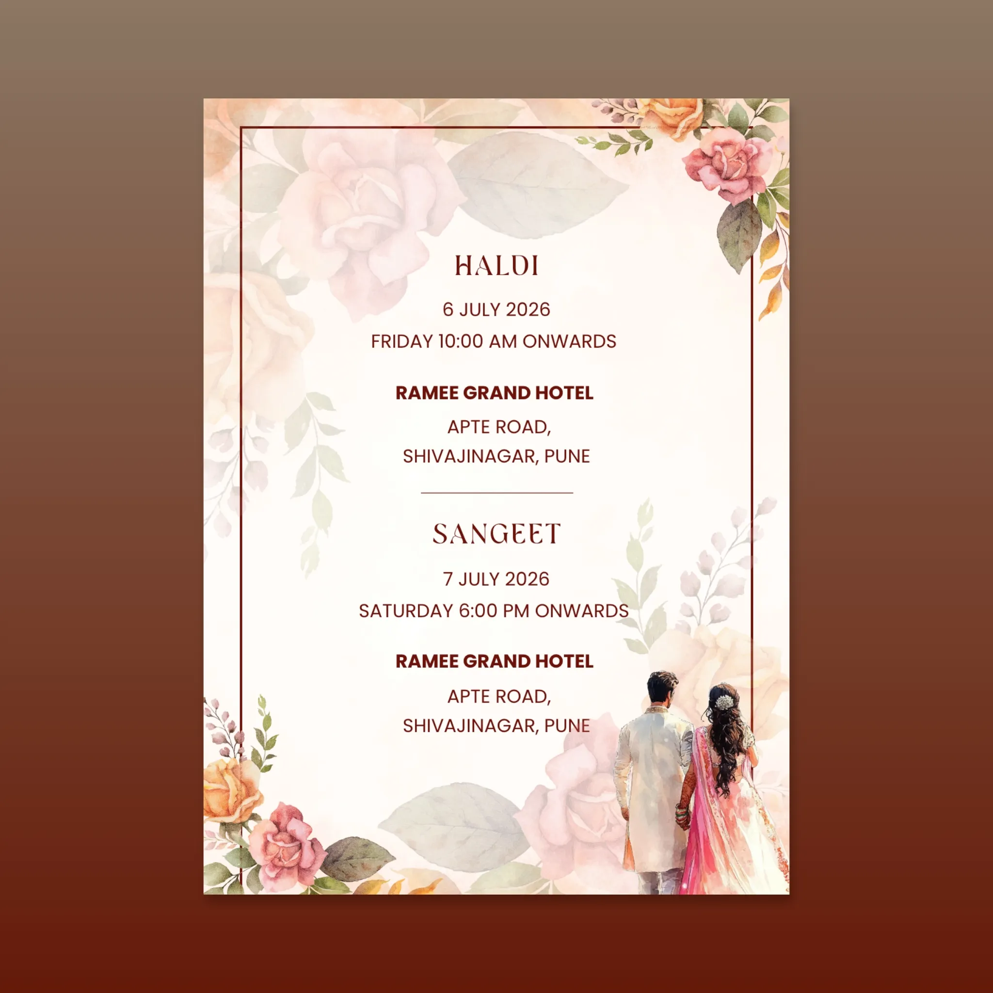 Name your events as creatively or traditionally as you wish — “Ananya’s Haldi,” “Rohan’s Baarat,” or “Sufi Night with Friends” — your card, your way.