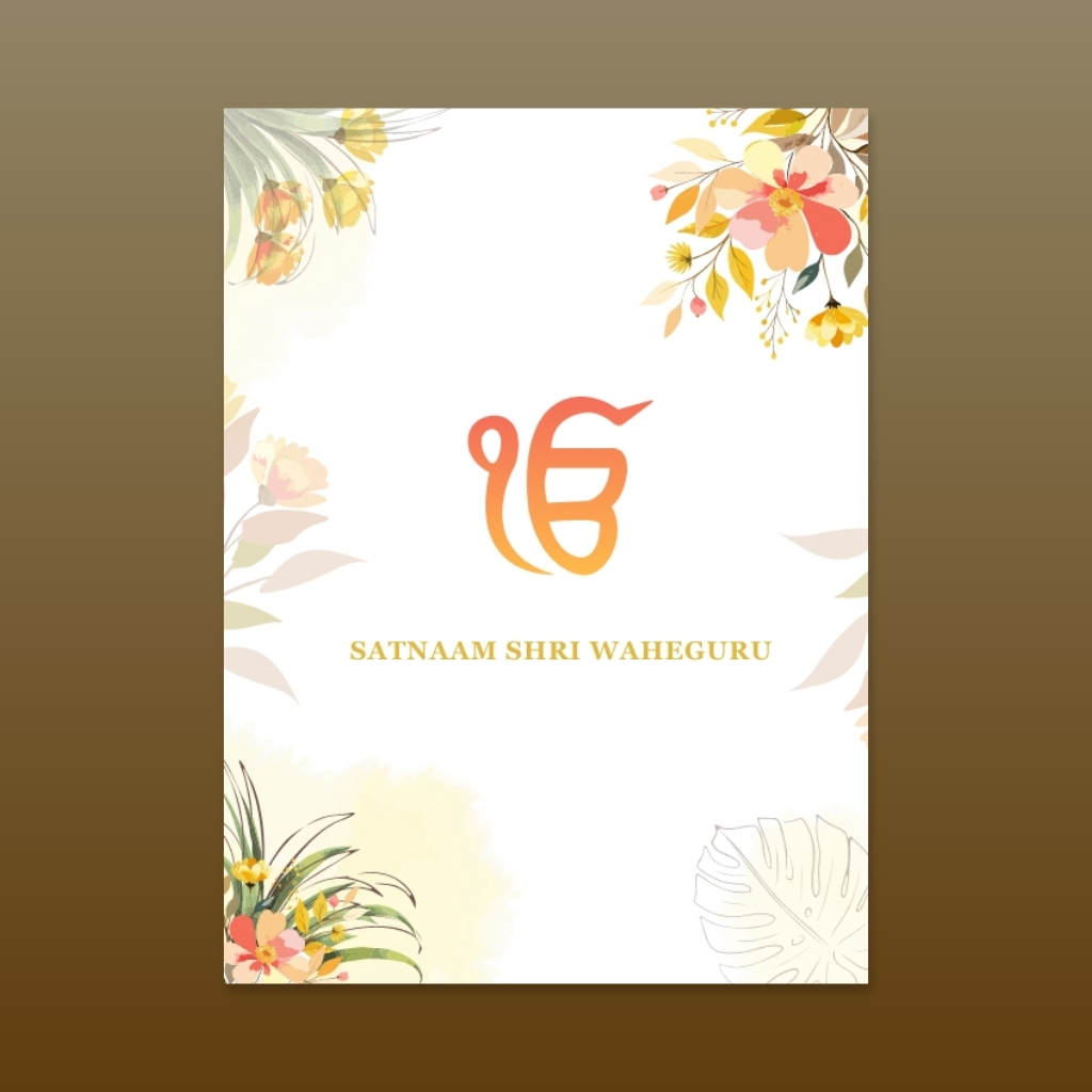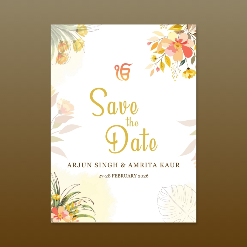 A serene Sikh-inspired watercolor design featuring warm autumn leaves, soft peach tones, and elegant traditional script, symbolizing divine blessings and graceful wedding aesthetics.
