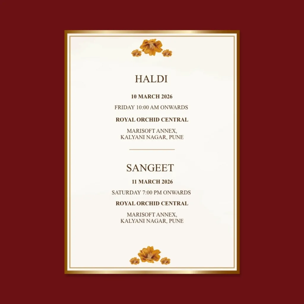 Name your events as creatively or traditionally as you wish — “Ananya’s Haldi,” “Rohan’s Baarat,” or “Sufi Night with Friends” — your card, your way.