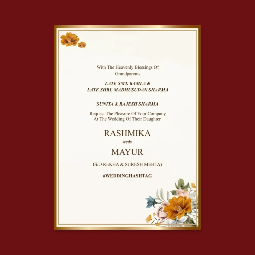 A refined design featuring soft ivory textures, intricate golden outlines, and delicate floral accents. The blend of minimal serif fonts and classic motifs creates a serene, timeless aesthetic, ideal for couples seeking a sophisticated wedding theme rooted in cultural elegance.