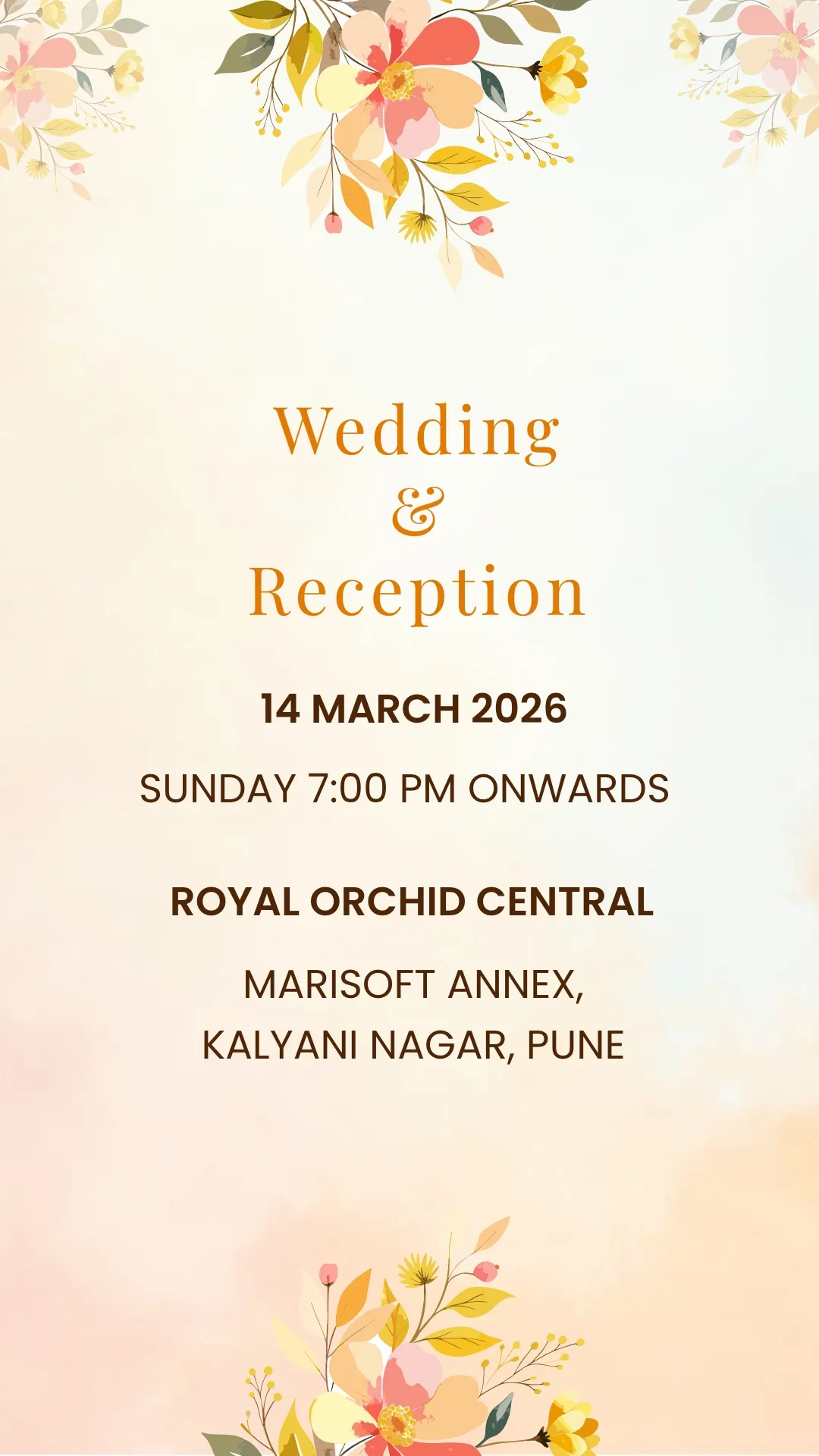 This video invitation showcases a gentle watercolor backdrop enriched with bold, stylized florals in warm coral-orange tones. Designed as a complete wedding suite, it highlights every function – from Haldi and Sangeet to the Wedding and Reception. A romantic, flowing script for names paired with a clean sans-serif for details creates a balanced, modern look. With its vibrant hues and cheerful energy, this design brings a bright, festive charm perfect for contemporary, joy-filled celebrations.