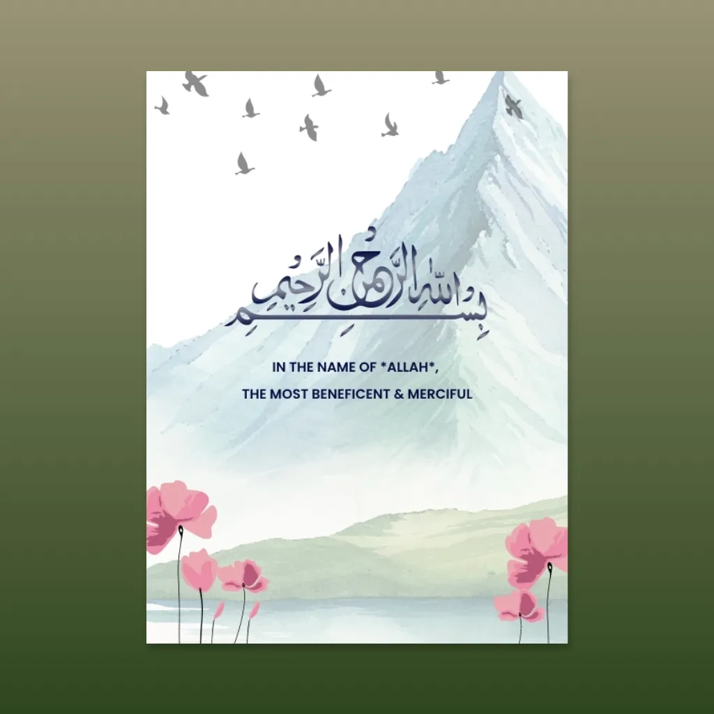 A serene Islamic watercolor design featuring calming sky washes, minimal green calligraphy, and charming rustic town illustrations, symbolizing tranquil new beginnings rooted in faith, harmony, and celebration.
