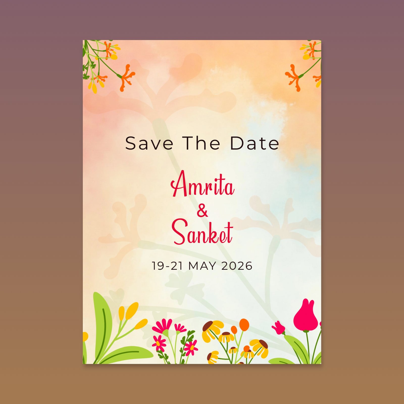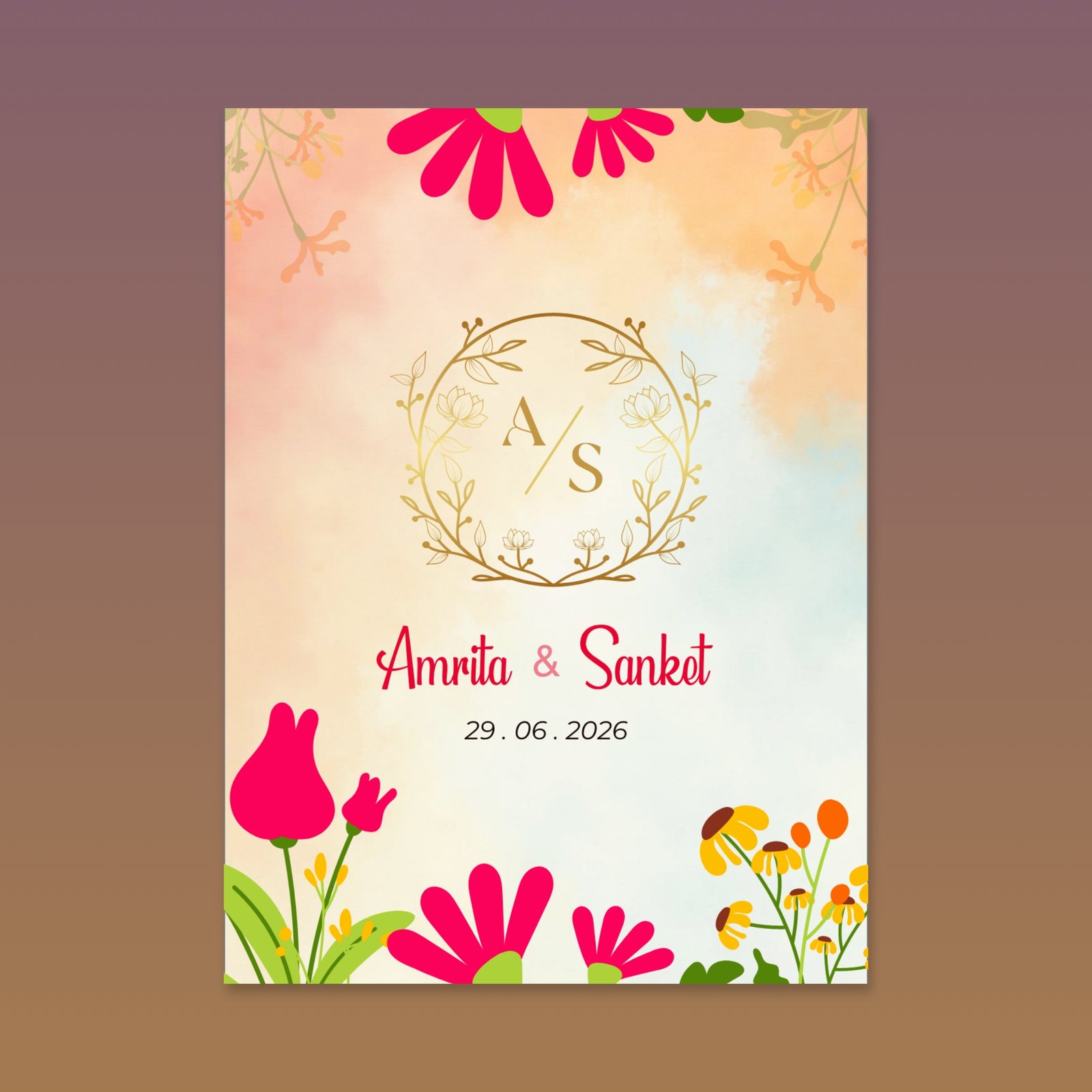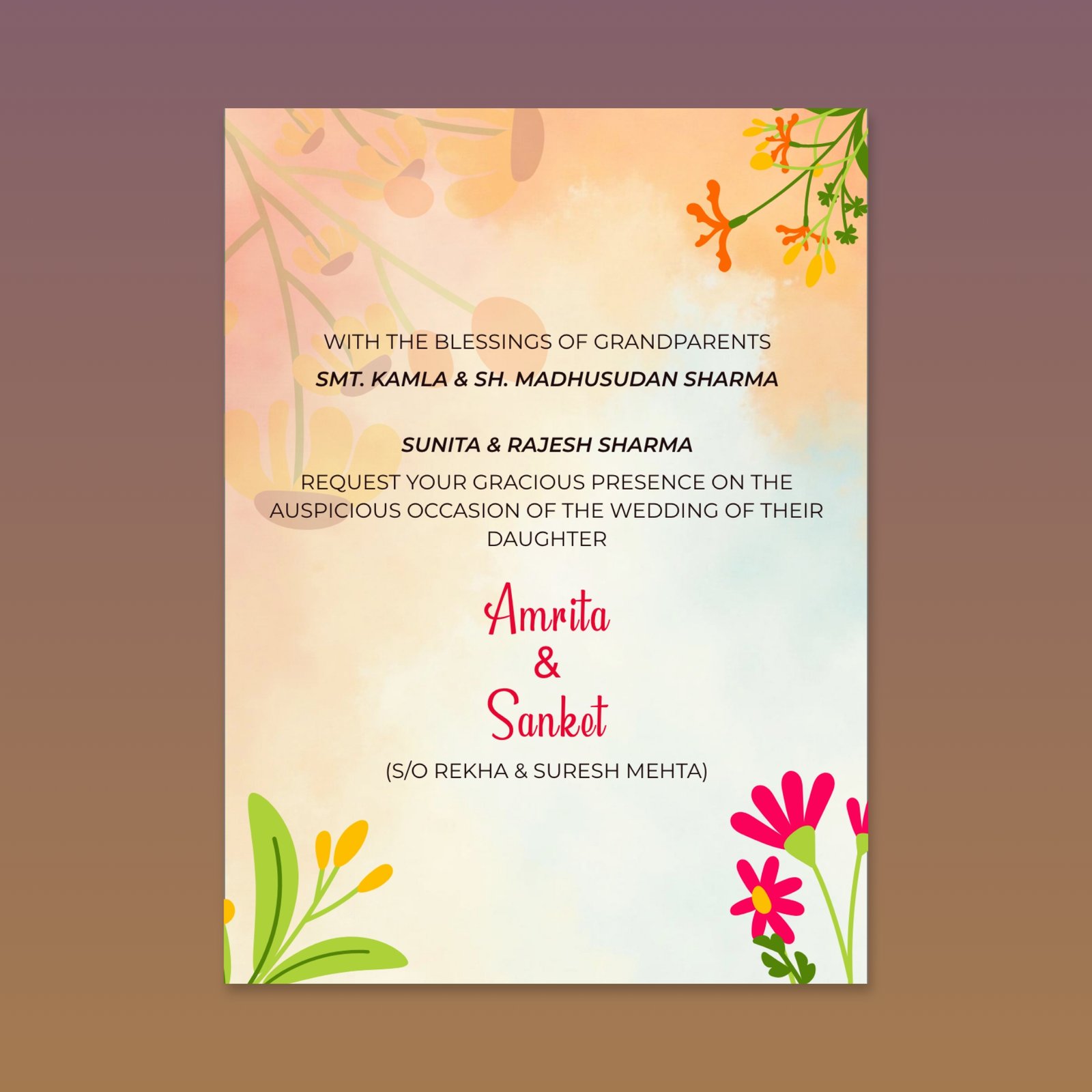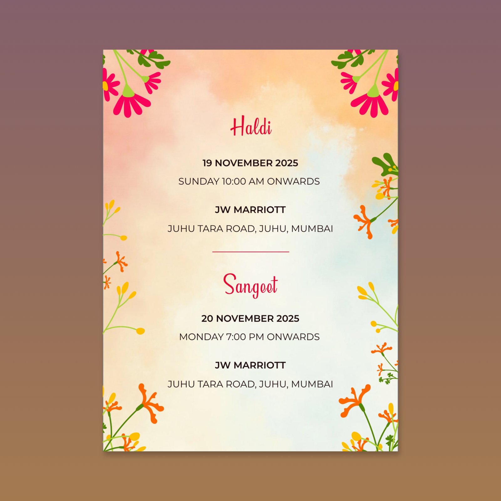 This multi-page invitation is defined by its bright watercolor background, transitioning from golden yellow to soft orange, which immediately sets a festive and warm mood. It functions as a complete wedding suite, detailing all functions including Haldi, Sangeet, Wedding, and Reception. The design is framed by stylized florals in contrasting pinks and oranges. It employs a romantic script for key names and a clear sans-serif for details, providing a cheerful, vibrant, and modern aesthetic perfect for a lively celebration.
