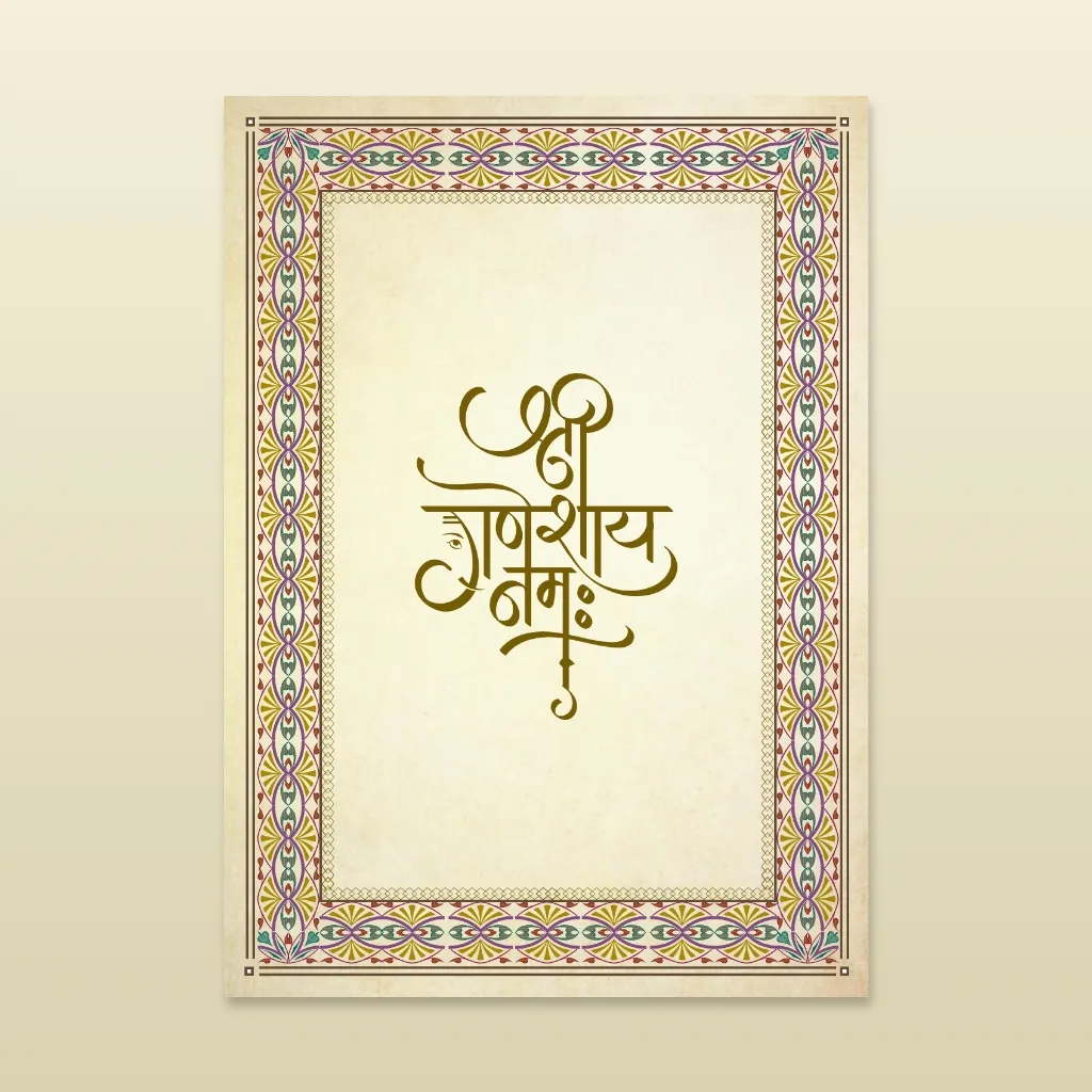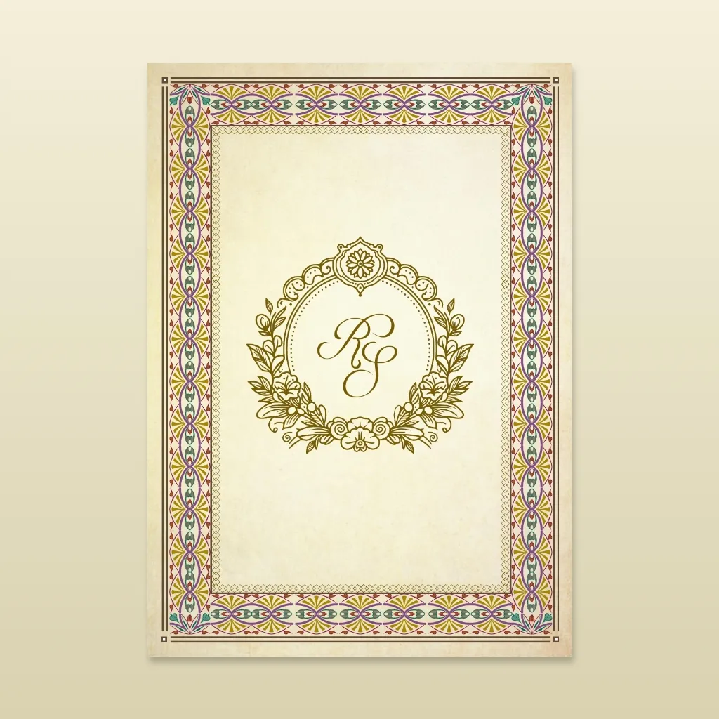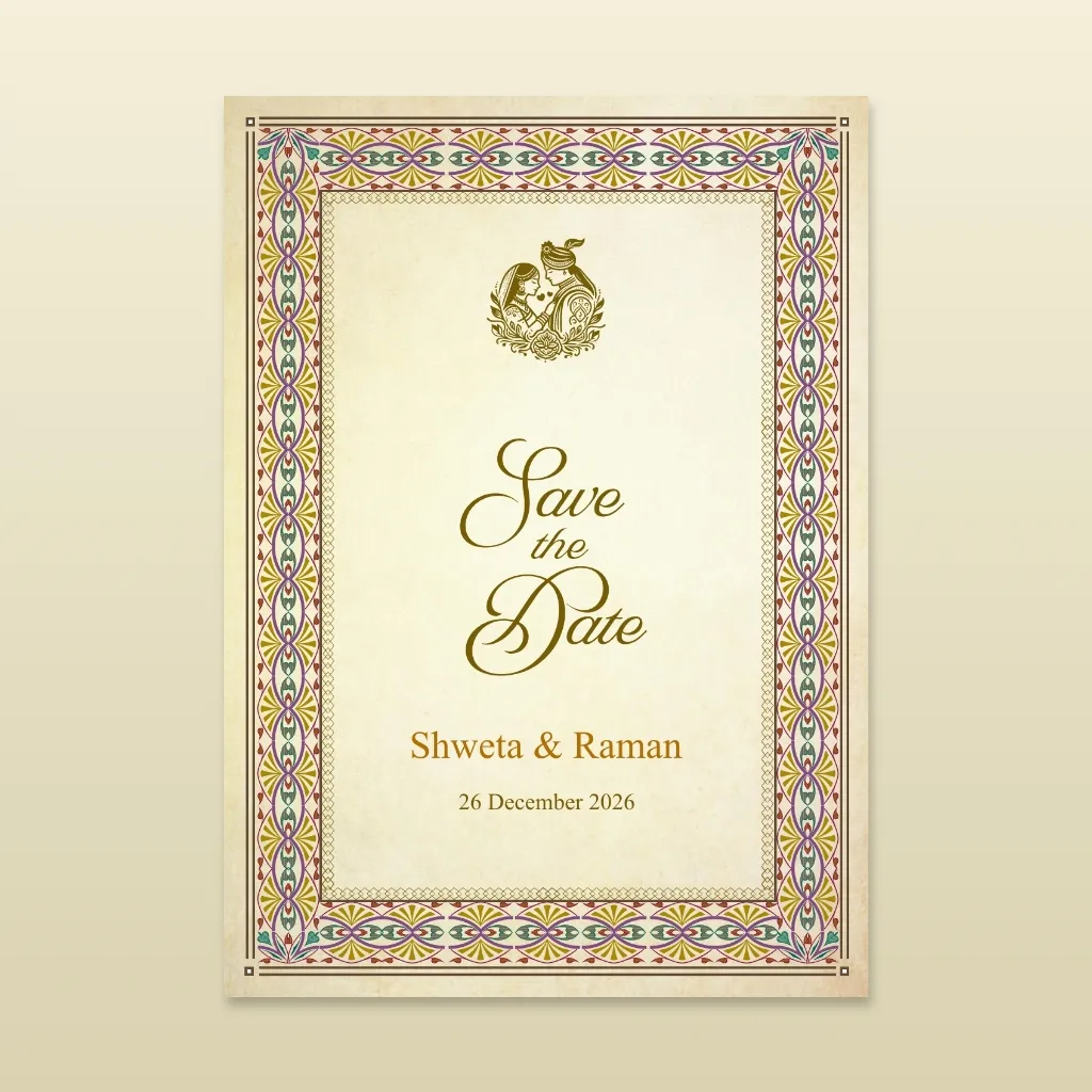 This design features an ornate traditional border inspired by vintage Indian artistry, combined with gold accents and delicate line illustrations. The classic serif typography and heritage motifs make it ideal for elegant wedding themes rooted in culture and timeless celebration aesthetics.